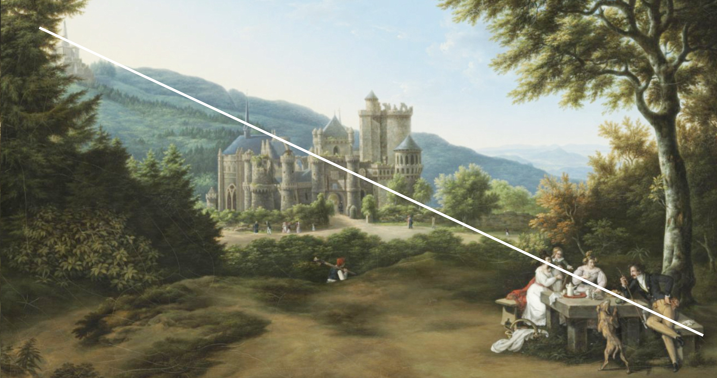 Kunstgriff des Malers - Anornung von Gruppe, Löwenburg, Okrogon/Herkules in einer Diagonale re unten nach links oben